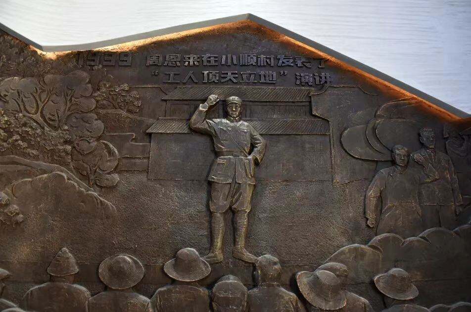 在小顺红廉馆里,以工人的“工”字为主要视觉形象打造的“顶天立地”景观,周恩来发表抗战演讲雕像,直观再现了烽火岁月里最为激动人心的时刻。数十载光阴流转,周恩来“顶天立地”的振臂高呼,其力量穿透岁月,在小顺的发展历程中回声嘹亮,红廉基因一直引领激励着小顺村干部群众不忘初心,奋斗如一。